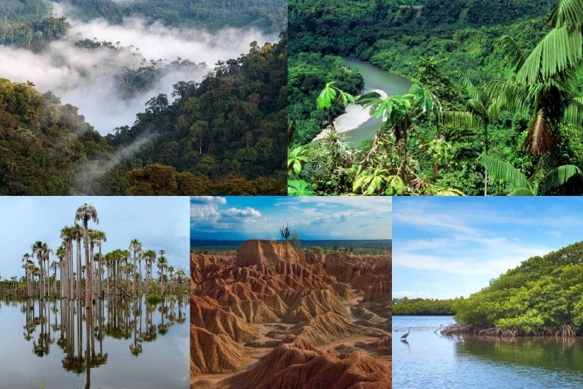 Тропические леса простираются в основном через регион Амазонки-Ориноко, побережье Тихого океана и часть Западных Анд. Они характеризуются жарким и влажным климатом. Эти экстремальные климатические условия приводят к экосистеме, где температура колеблется от 22 до 34 ºC в течение всего года, с минимальными колебаниями между самыми теплыми и самыми холодными месяцами. В этих лесах воздух влажный, и присутствуют различные деревья, которые могут достигать высоты от 30 до 50 метров (98-193 футов).