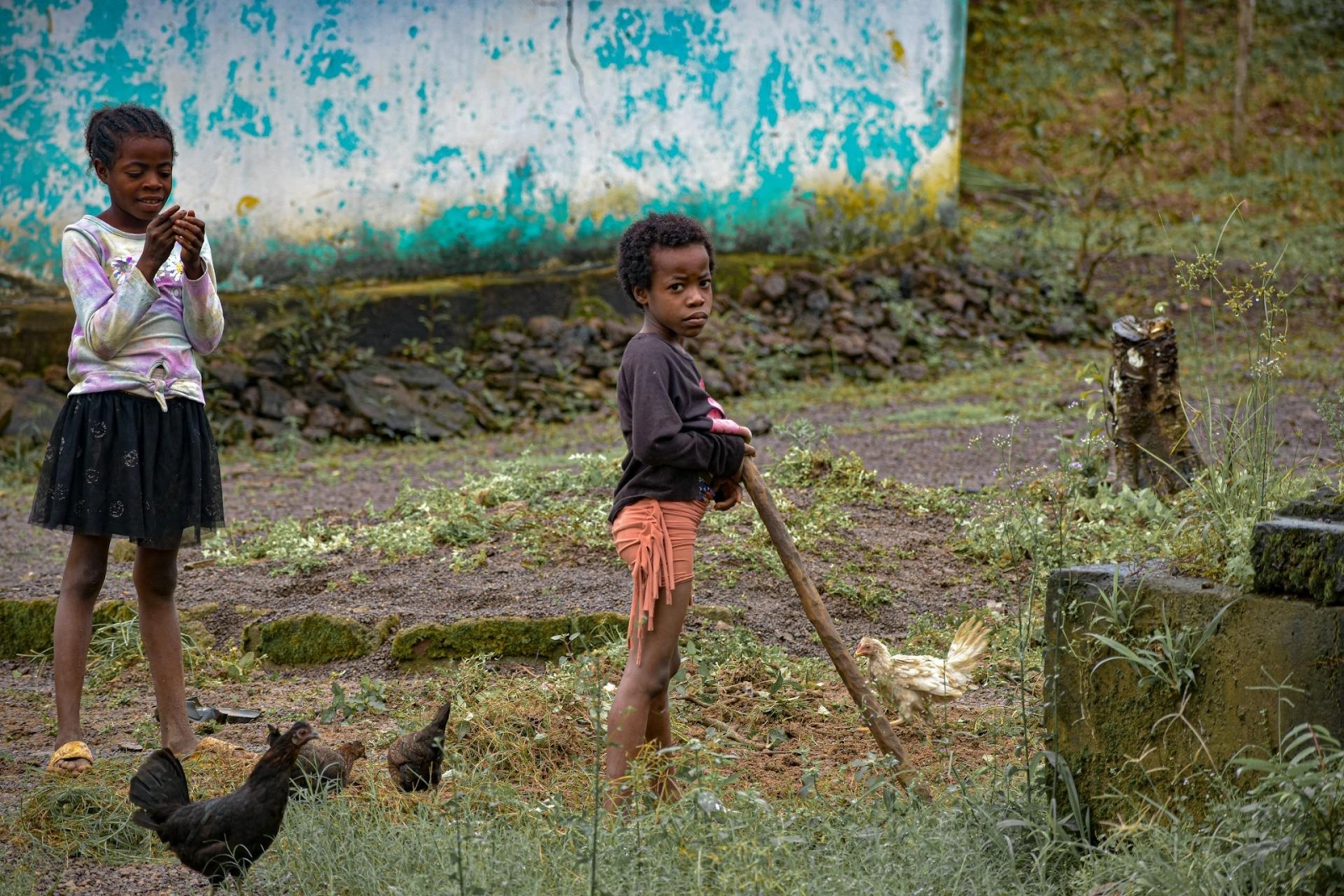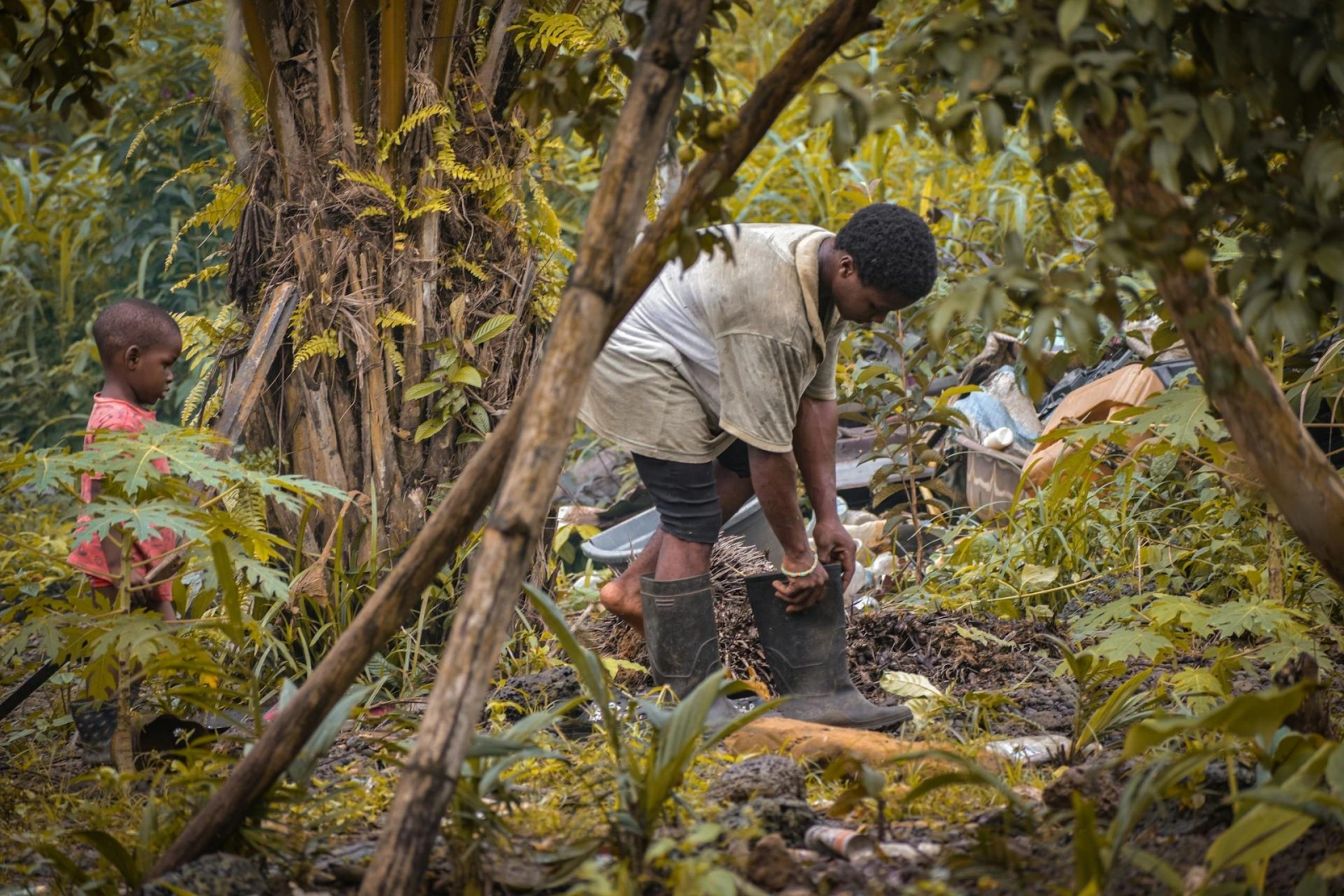 Складской сарай под цинковой крышей кренится под напором зарослей. Внутри: треснувшие алюминиевые вёдра, сложенные как броня брошенной армии. Мачете, проржавевшие до кружева. Оцинкованная кружка с погнутой ручкой стоит на верстаке, будто ждёт хозяина. Снаружи трактор Fordson Major уходит в грязь, руль увенчан лианами.