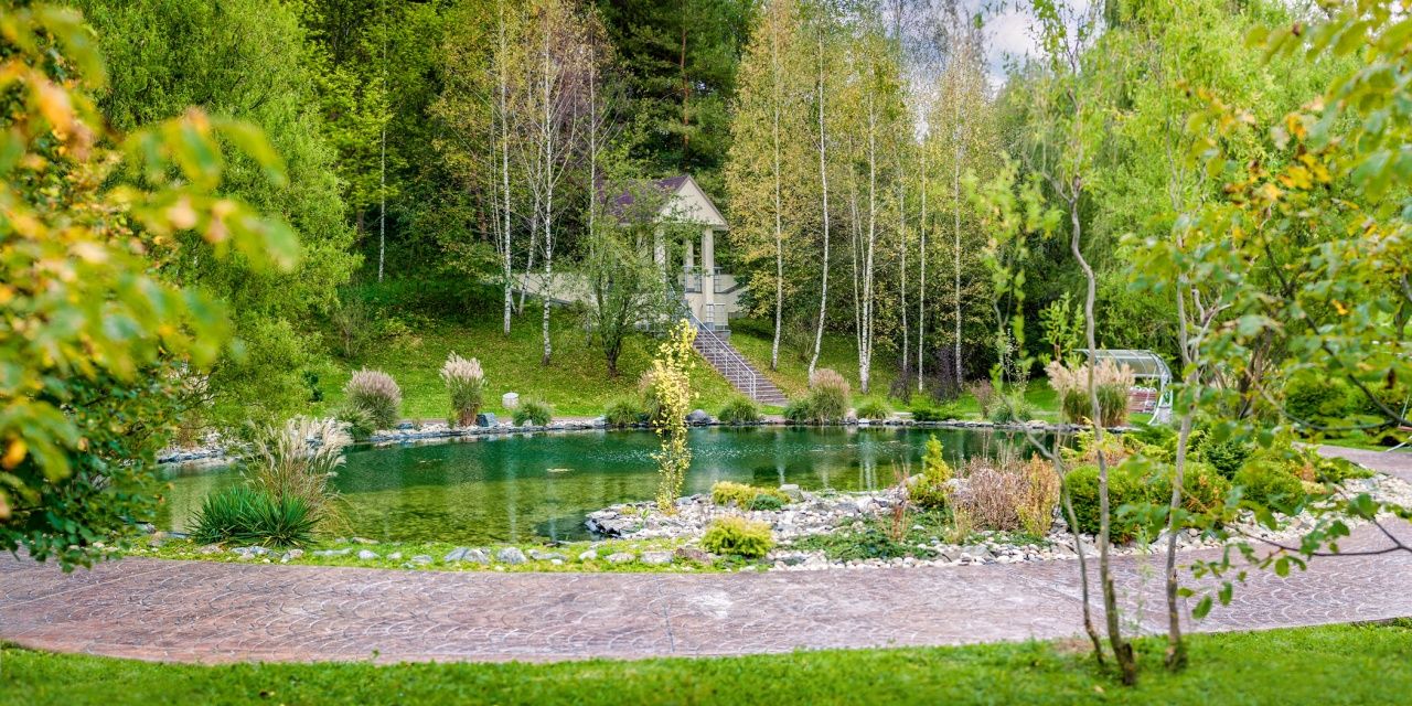 В Нижнем парке можно полюбоваться искусственно созданным Зеркальным прудом. На его берегу выстроена изысканная беседка с цветными витражами. Беседка получила название Хрустальная струя за маленький водопад, вытекающий из ее основания.