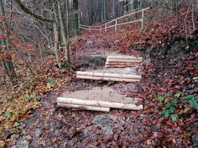 Учитывая, что тропа проходит в основном по лесным дорогам, иногда возникают проблемы с водоотводом. Чтобы исправить ситуацию, муниципалитет обновил тропу и сделал новые деревянные ступени.