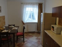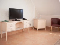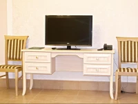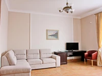 Номер, меблированный в классическом стиле, с гостиной зоной с телевизором, собственной ванной комнатой и мини-кухней с микроволновой печью и холодильником.