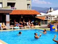 Отличный отель, русских мало, как и везде в Мармарисе. Обслуживание отличное, бар бесплатный, пиво, джин, водка, коньяк, кола, спрайт, фанта, чай, кофе, молоко, наливаешь сам днем, а вечером бармен не скупиться на спиртное, приходилось даже говорить чтобы коктель не очень крепкий делал. До моря 3 минуты, но мы ходили не на наш пляж, а ближе к пляжным барам, там музыка играет, а для тихого лежания