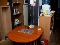 Кухонный уголок (микроволновка, электрическая плитка, холодильник), кулер с функцией нагрева и охлаждения воды, посуда: кастрюли, тарелки, приборы