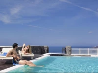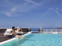 Our Two Bedroom Villas offer spacious living room (some with fireplace), equipped with flat screen TV sets, a kitchen with dining table and facilities, two separate bedrooms with LCD TVs and two bathrooms, one offering Jacuzzi tab. The lovely veranda offers breathtaking view to the famous Caldera, equipped with comfortable furniture and sun loungers on the wooden deck of the villa’s private swimming pool.