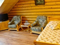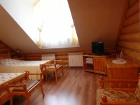 Скромно расположившийся на мансардном этаже гостиничного комплекса, наш номер полулюкс встретит вас по-русски душевно. Массивными, словно вековыми бревенчатыми стенами, теплыми деревянными полами и уютной скошенной крышей. Этот номер предназначен для трехместного размещения.