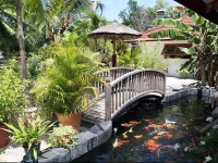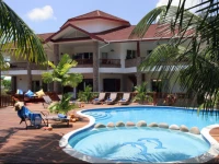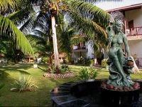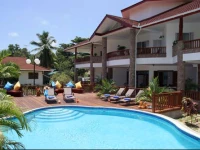 Чудный отельчик. Очаровал нас с первого взляда. Бассейны с декоративными рыбами и перекидными мостиками - так не типичны для Сейшельских отелей. Отель находится на второй линии, но от пляжа его отделяют не более 10 метров. У бассейна есть джакузи. Стандарты расположены дальше всего от ресепшен. У каждого номера есть терраса с лежаком. В номере очень высокие потолки. В отделе много темного дерев