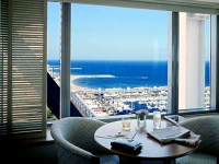 отель приятный- подъезжаешь и тебя встречает приятными переливами фонтинчики. расселили очень быстро, номер был высоко, сейчас уже не вспомню на каком этаже, но что-то не меньше двадцатого. вид был боковой на море и город. великолепно. прямо под окном сделана лежаночка- удобно созерцать покачивающиеся яхты, людей на пробежке и снующий транспорт.