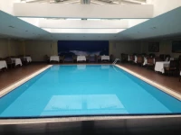 В ресторане со столиками вокруг бассейна подают блюда местной и интернациональной кухни.