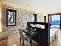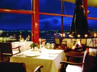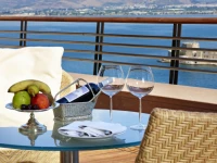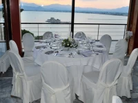 Гастрономический ресторан a la carte. Через стеклянные стены открывается захватывающий вид на море и укрепленный остров Буртзи. Одно из лучших впечатлений Греции.