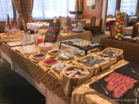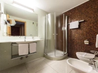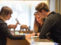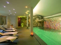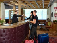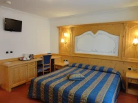 Отель построен в стиле альпийского шале, в оформлении помещений использовано светлое дерево.