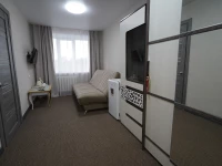 Просторный номер для размещения одного-четырёх человек. В комнате двуспальная кровать (шириной 140 см) + тахта, телевизор, прикроватные тумбочки, чайный набор (чайник, стаканы, чай в пакетиках, сахар в стиках).