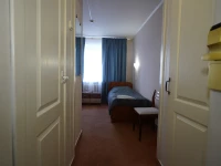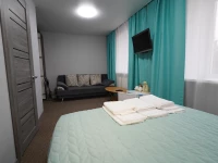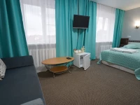 Просторный номер для размещения одного-четырёх человек. В комнате двуспальная кровать (шириной 160 см) + диван-кровать, телевизор, прикроватные тумбочки, чайный набор (чайник, стаканы, чай в пакетиках, сахар в стиках).
