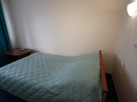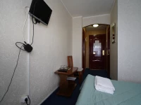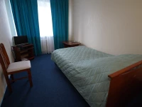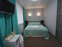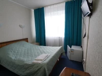 Номер для размещения одного-двух человек. В комнате двуспальная кровать (шириной 140 см), телевизор, холодильник, прикроватные тумбочки.