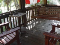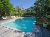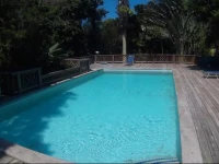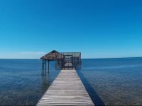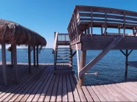 Плавательный бассейн, частный причал с соломенной крышей и солнечной террасой. Есть лестница в конце причала для легкого доступа к воде.