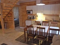 В коттедже: 2 спальни внизу (в каждой по 2 кровати), наверху 4 кровати. Кухня/столовая, электрическая сауна.