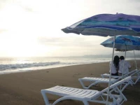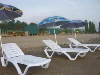 Собственный, песчано-галечный. На пляже имеются лежаки, зонтики. Водные развлечения: катер, скутер, морские прогулки, волейбольная площадка, дискотека, кафе-бар. Аренда надувных матрацев (разных размеров) и детских спасательных аксессуаров.
