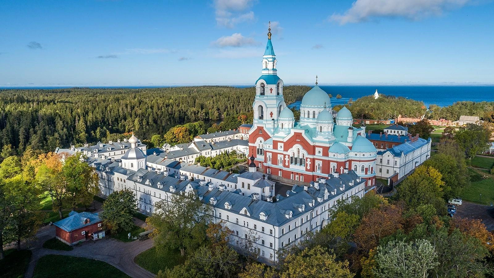 • насыщенный голубой цвет куполов Спасо-Преображенского собора и Воскресенский скит из ярко красного кирпича на острове Валаам