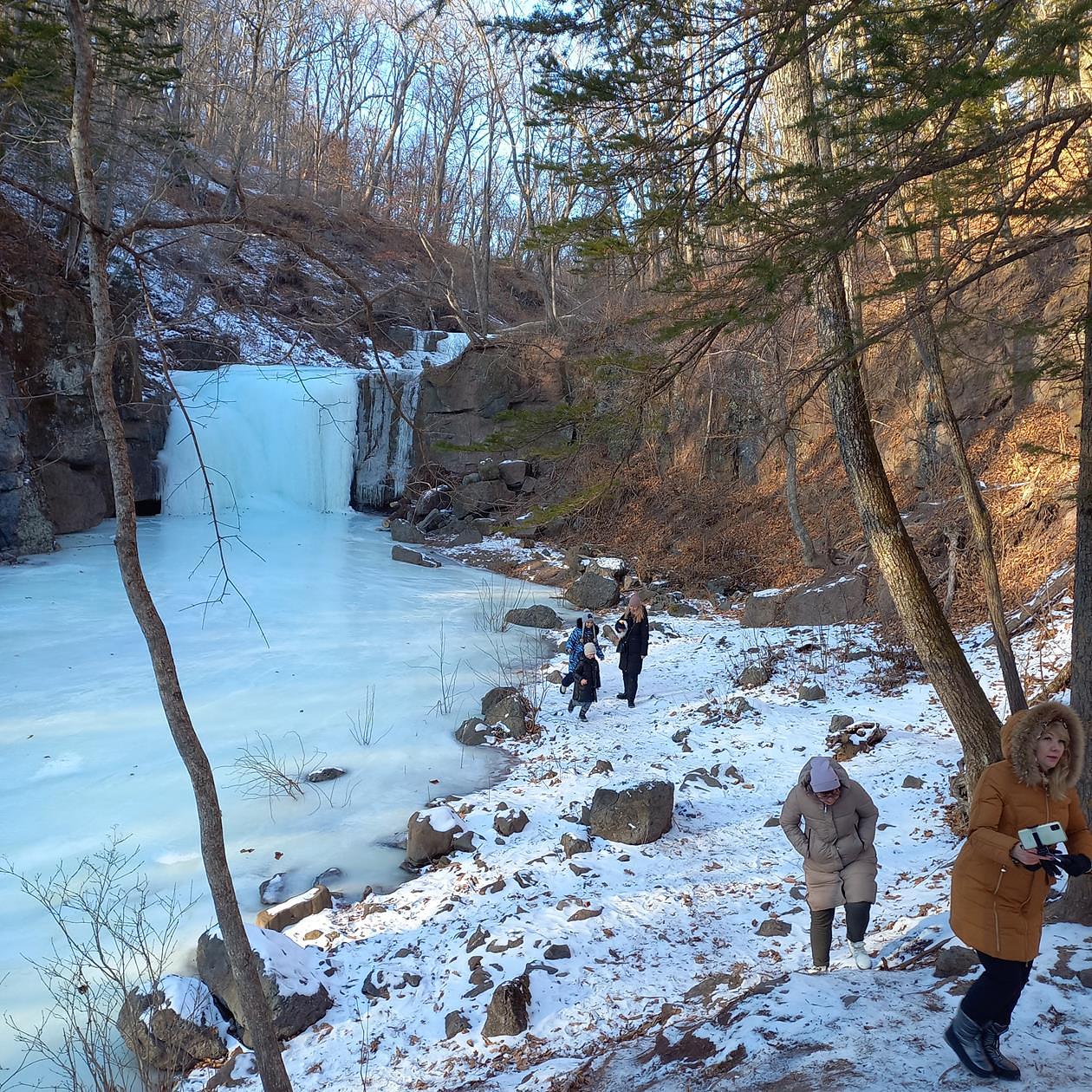 Остановка на каскаде замерзших Кравцовских водопадов. Прогулка по заснеженному лесу, красивые фотографии на память.