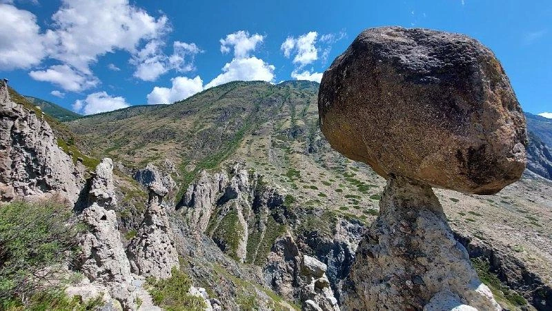 Далее пешая прогулка в урочище Ак-Курум к Каменным грибам. Необычные скальные образования напоминают грибы, благодаря своим “шляпкам” и “ножкам”. Они словно живут своей жизнью, меняя форму и размер под воздействием природных сил. Поднимаясь к Каменным грибам, насладимся потрясающим видом на извилистые воды реки Чулышман и её тихое урочище.