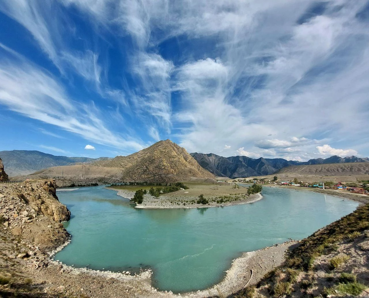 Слияние рек Чуи и Катуни — священное место, где две могучие реки встречаются, создавая удивительный природный феномен: их воды текут рядом, не смешиваясь, создавая поразительный контраст цветов!