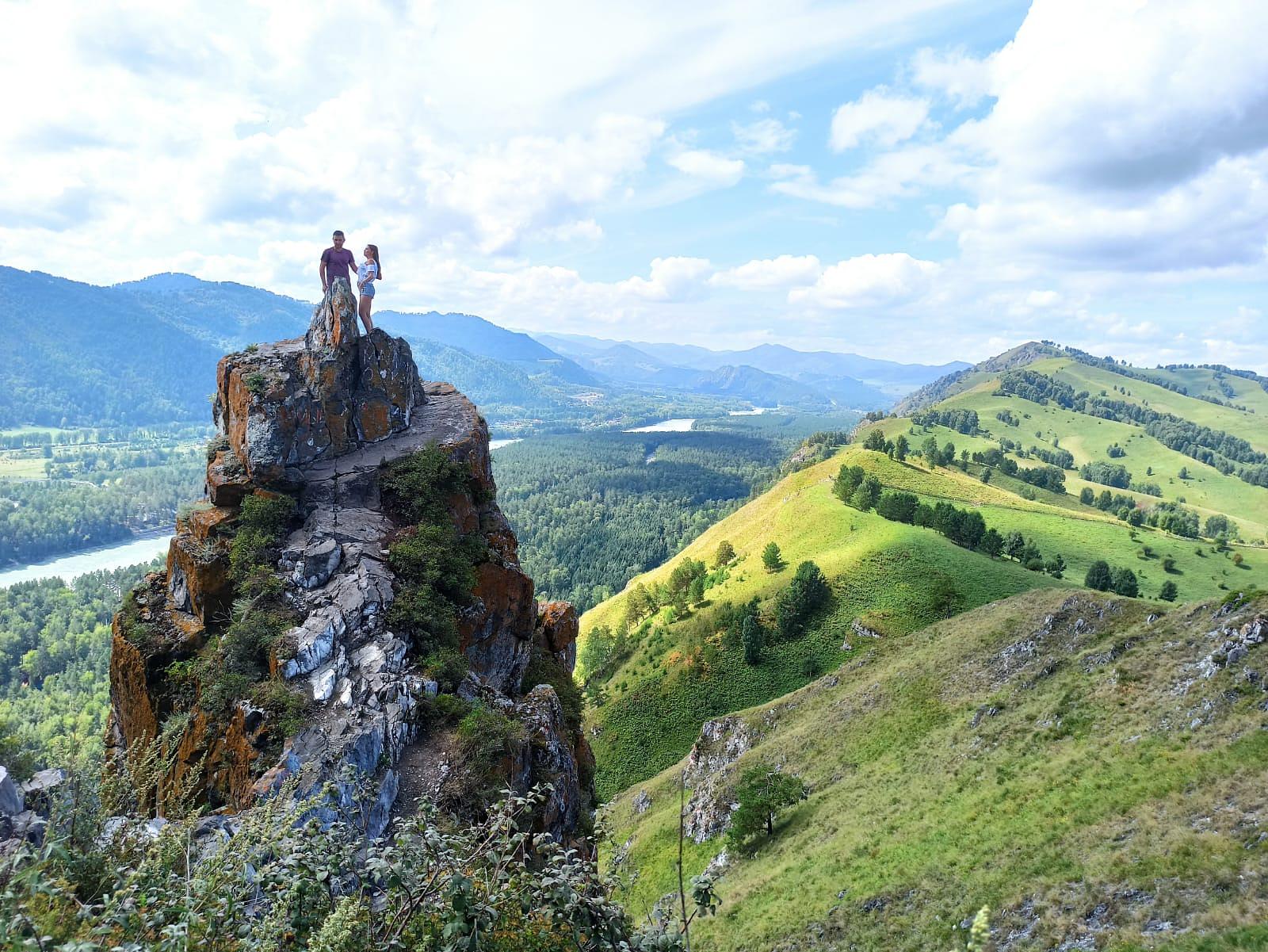 Со смотровой площадки на горе открывается живописный вид на Телецкое озеро, старый Артыбаш, поселок Иогач, мост через Бию. А все это окружают волны гор, поросших кедрами и соснами.