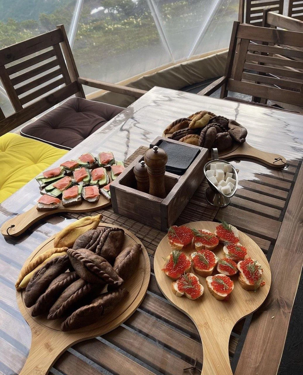 Походная кухня: В традициях гостеприимства всегда особое внимание уделяется тому, чтобы вкусно накормить гостя. Поэтому еда в нашем путешествии непременно останется одним из приятных впечатлений после его окончания. Команда поваров разрабатывает сбалансированное походное меню, с учетом активности каждого дня программы. Сытные завтраки, которые дадут необходимую энергию, удобные и легкие перекусы с собой на маршрут, чтобы поддержать силы в пути, полноценные горячие ужины в традициях домашней кухни согреют и порадуют душу и тело после активного дня. Продукты местных производителей, камчатские дикоросы, минеральная вода, морсы из местных ягод, и, конечно же, красная икра и блюда из свежей рыбы.