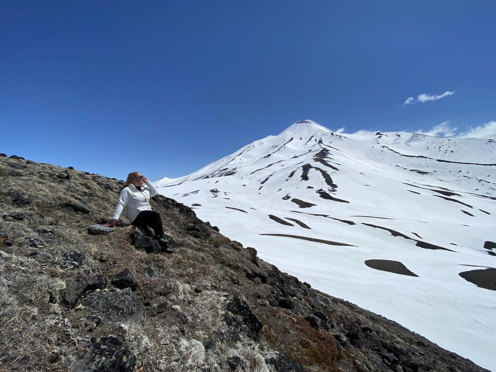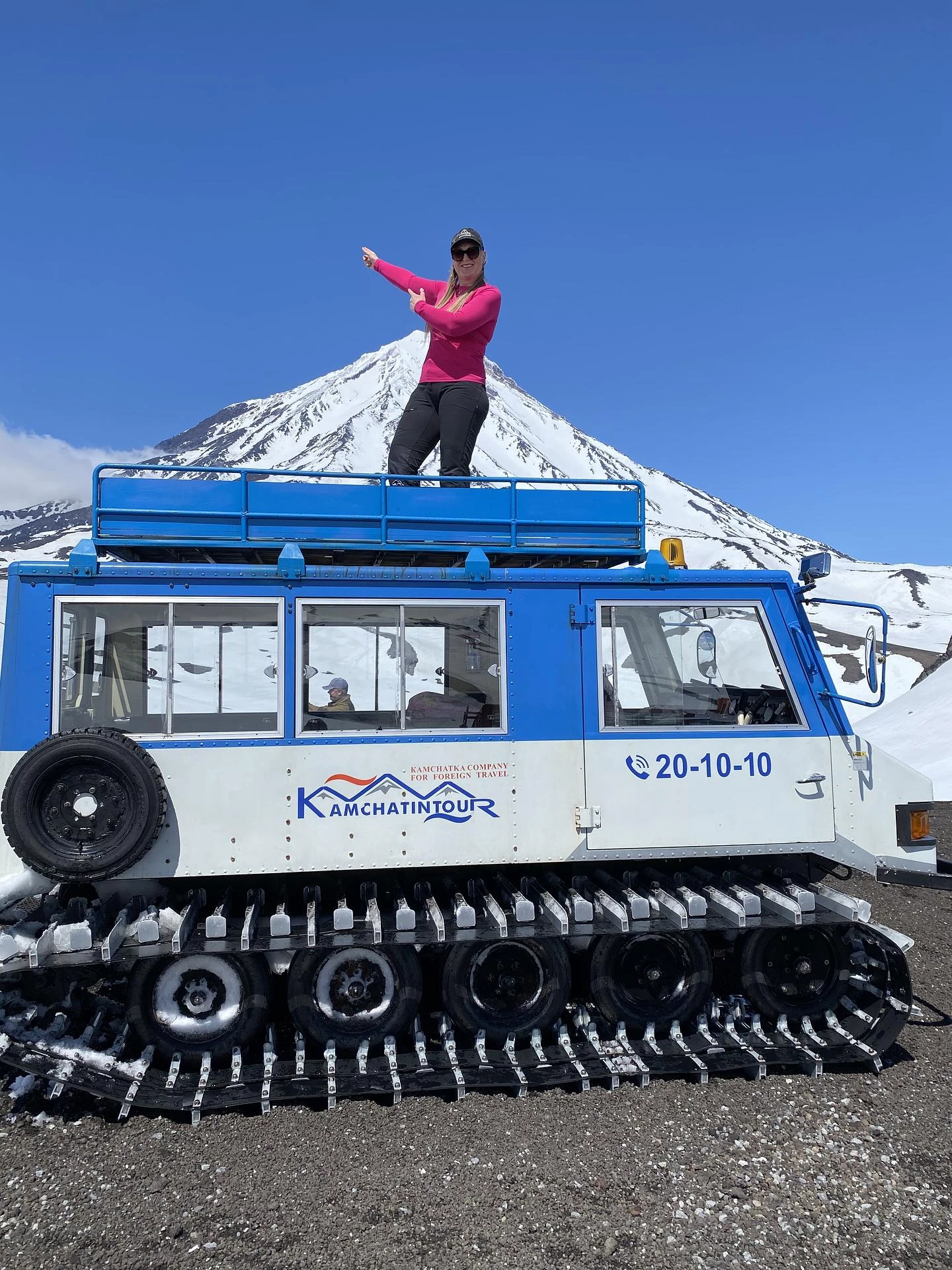 Поездка на вездеходах в район Мутновского вулкана. Остановка на смотровой площадке Вилючинского перевала с видом на Вилючинский вулкан.