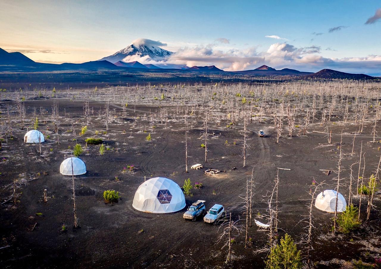 Подъехав к Толбачинскому долу, проедем 13 км по шлаковым полям, вдоль лав и шлаковых конусов в «Мёртвый лес», где находится наш лагерь. Пешая прогулка по «Мертвому лесу», подъем на ближайший конус, с которого открываются красивейшие виды на «Мертвый лес», шлаковые конуса и вулкан Большая Удина. Возвращение в лагерь. Ужин. Ночевка в комфортных отапливаемых шатрах.
