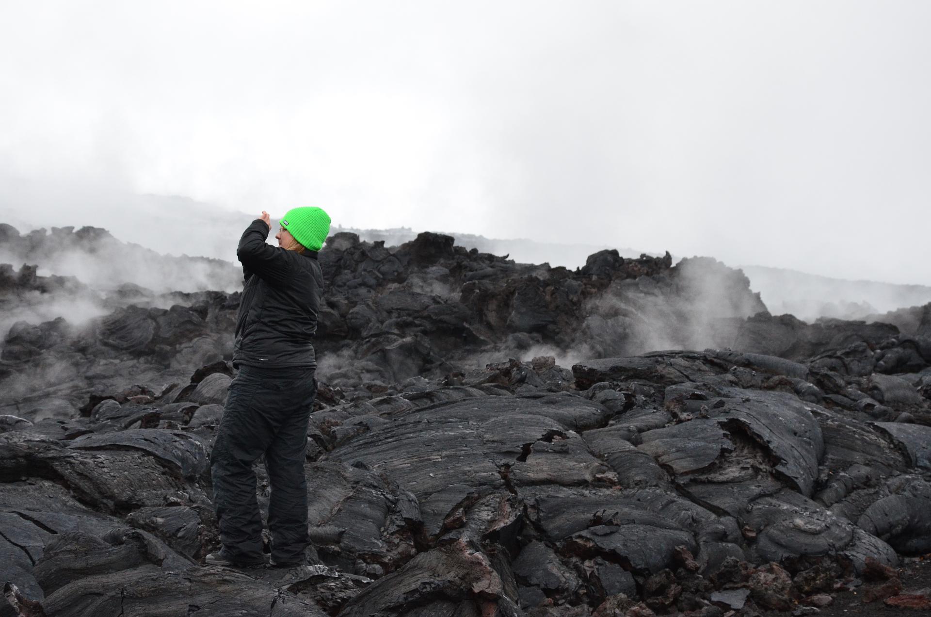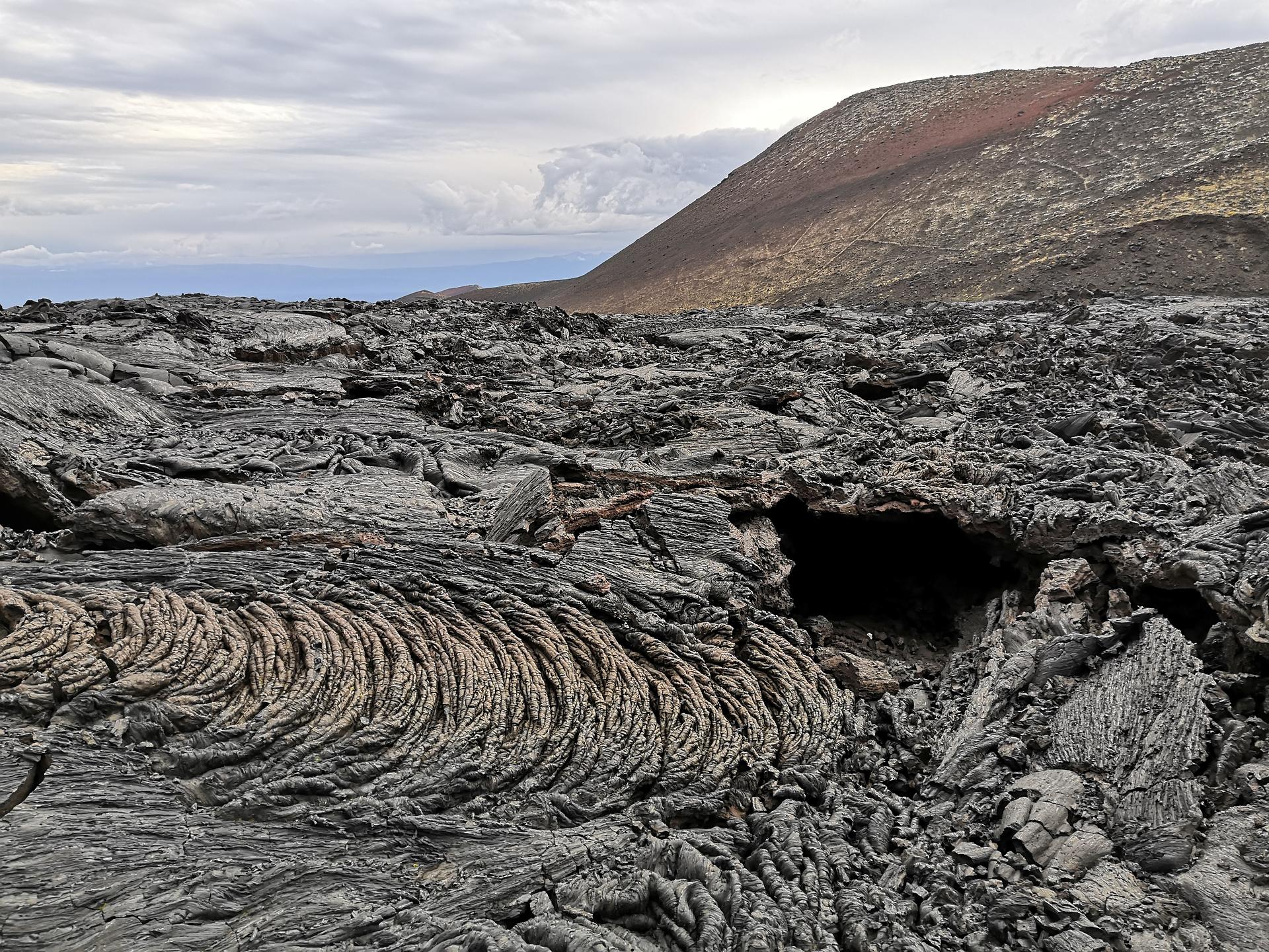 2 день. Завтрак. Переезд к новому лавовому потоку 2012 года. По пути заедем в базовый лагерь «Клешня» набрать воды и потографировать берингийских сусликов - евражек (14 км на автомобиле). Далее трекинг по застывшему лавовому потоку, посещение лавовых пещер, небольшое восхождение на конус Набока, извергавшийся 2013 году. На обратном пути перекус, с приготовлением пищи на горячих лавовых трещинах. Расстояние трека около 8 км в обе стороны. Возвращение в лагерь. Ужин. Свободное время. Ночевка в глэмпинге.