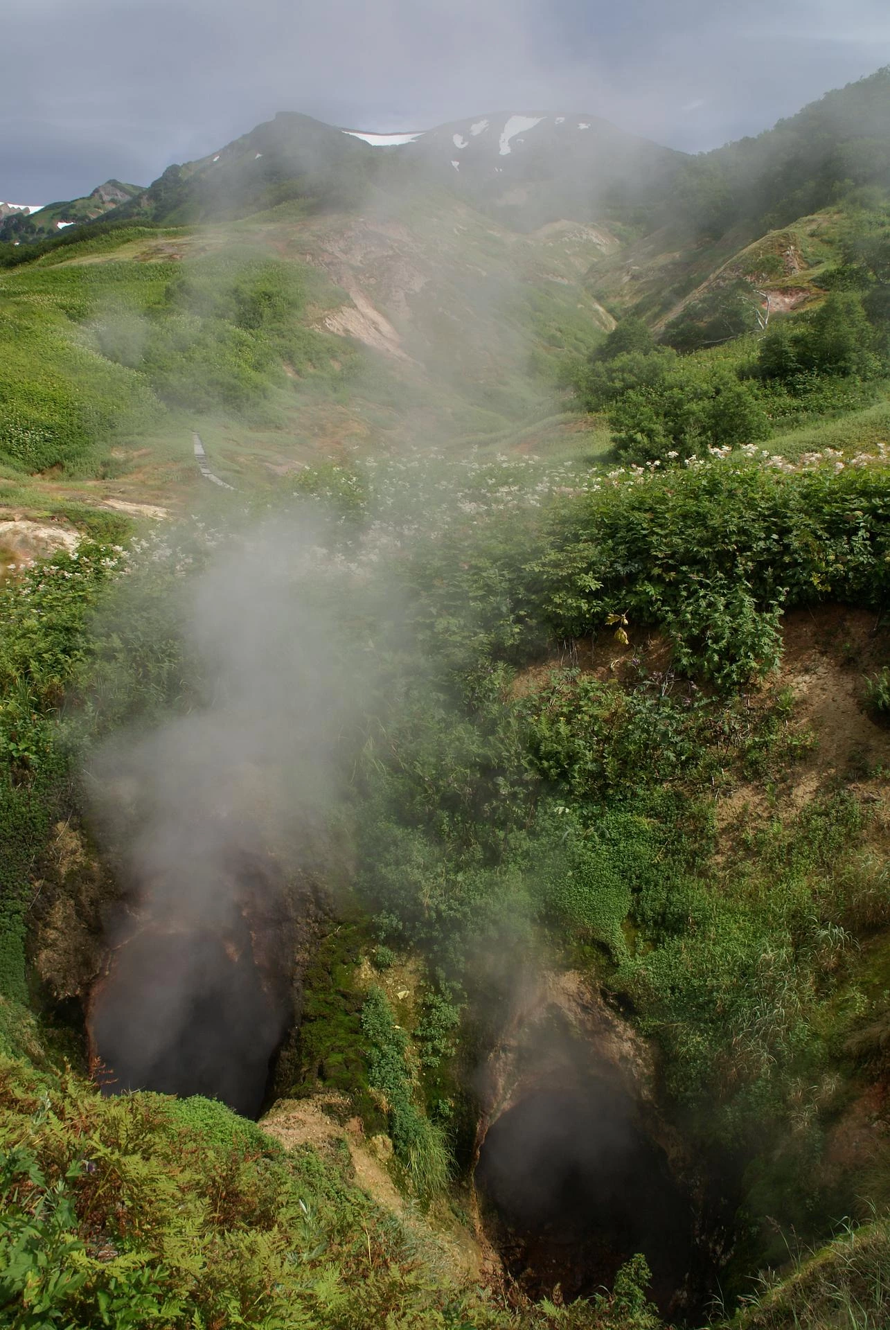 Раскалённый пар с рёвом вырывается прямо из земли, окутывая жёлто-красные камни и зеленые склоны долины. Все шипит, свистит, клокочет. Здесь же бурлящие серые лужицы с вязким кипятком, фонтанчики горячих источников, тоннели.