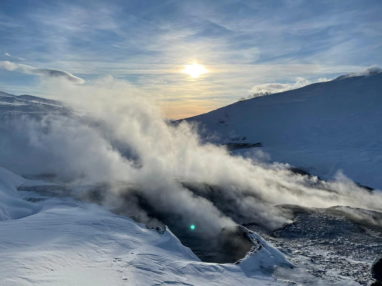 Легкий треккинг с небольшими подъемами и спусками до долины Дачных источников (около 2 км в одну сторону). Прогулка среди различных термопроявлений, которые будут практически у нас под ногами в максимальной близости - кипящих котлов, горячих источников, крупных и мелких парогазовых струй, небольших водопадов.