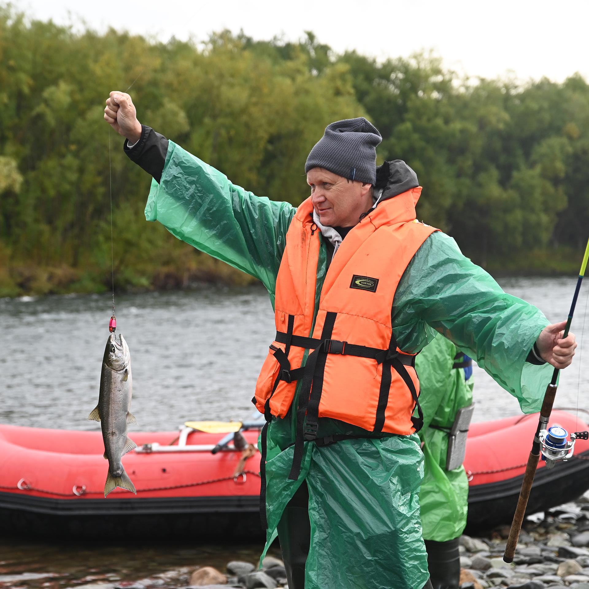 Инструктаж, экипировка, начало сплава на надувных 16-футовых рафтах. Гостям предоставляются спасательные жилеты, резиновые сапоги, рыболовные снасти на каждого участника (спиннинг, 3 блесны), в дождливую погоду - плащи.
