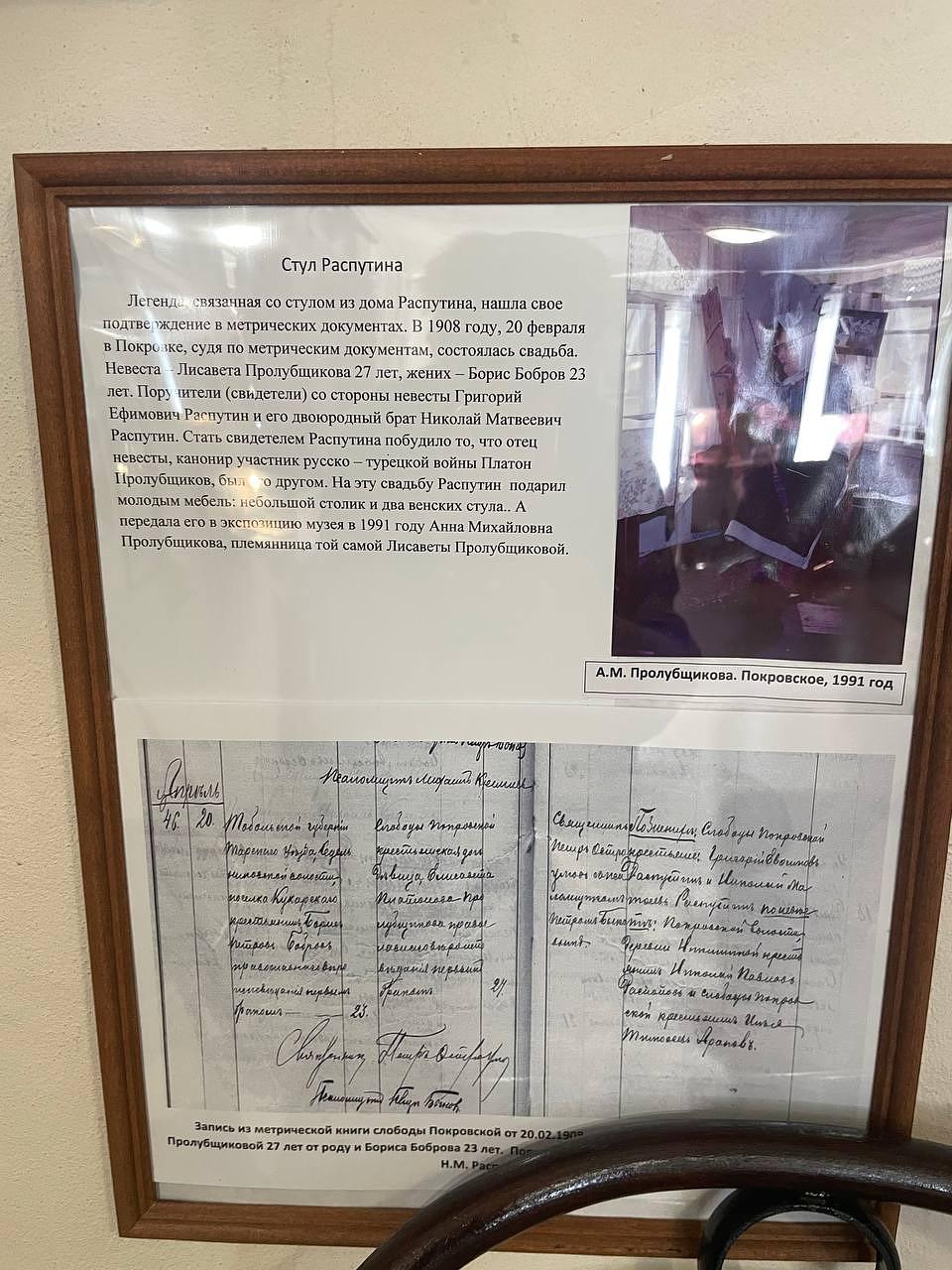 Самым же знаменитым экспонатом музея является старый венский стул Г. Распутина, по некоторым легендам он обладает некоторыми "магическими" свойствами.