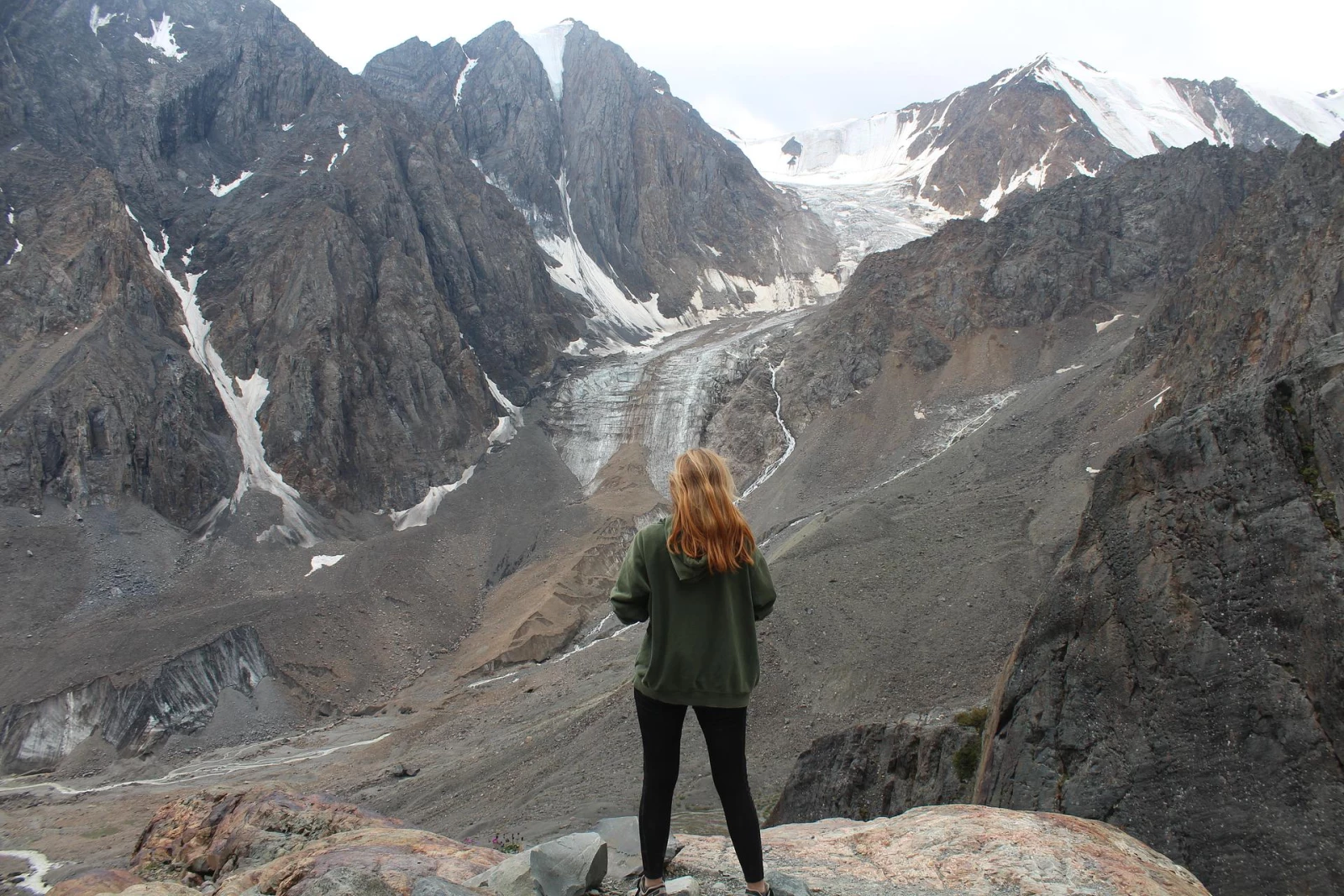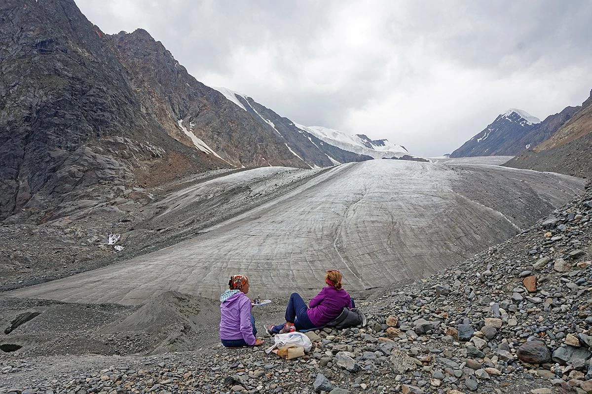 Главная цель сегодняшнего путешествия — смотровая площадка, с которой открывается потрясающая панорама Софийского ледника и величественных вершин Южно-Чуйского хребта.