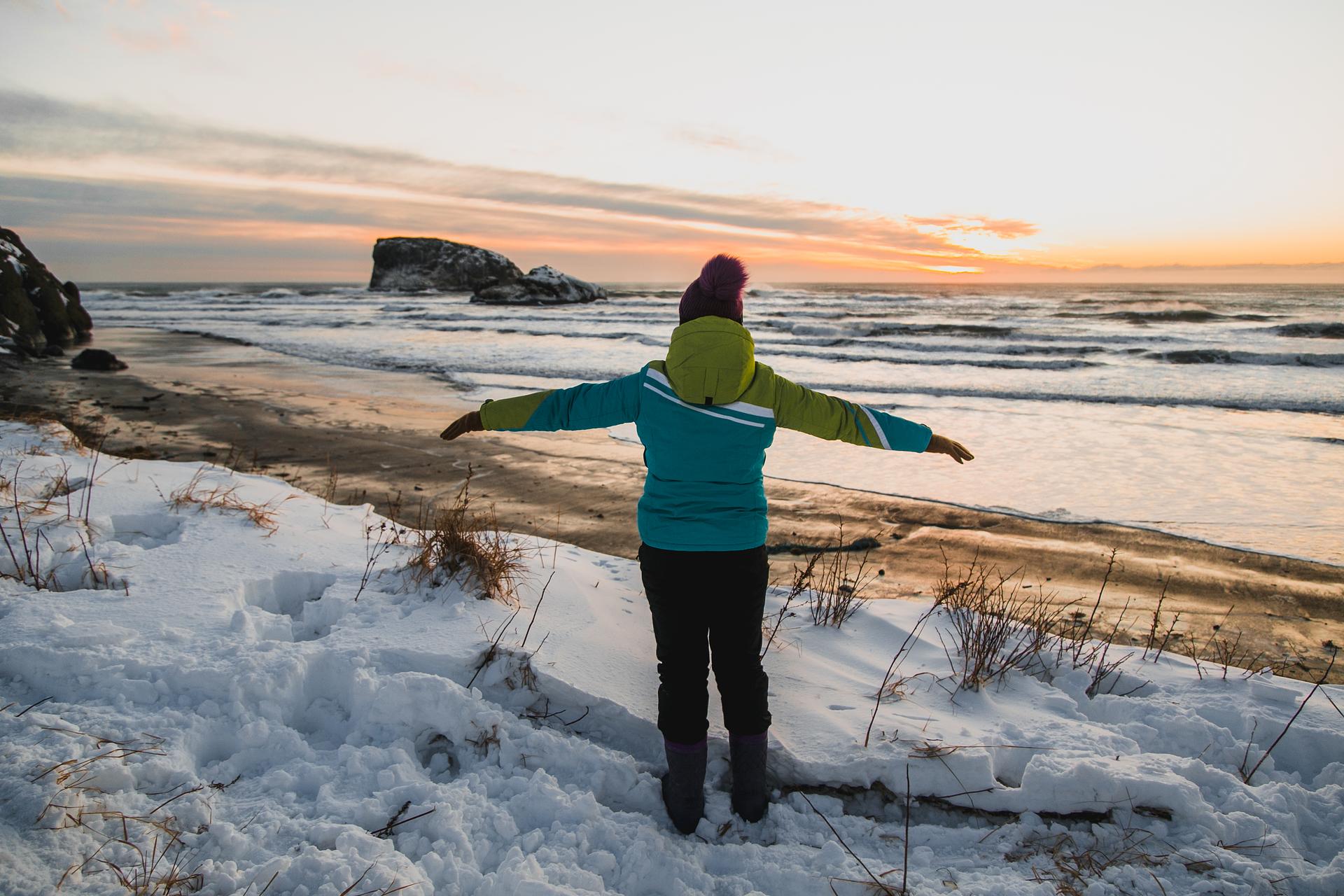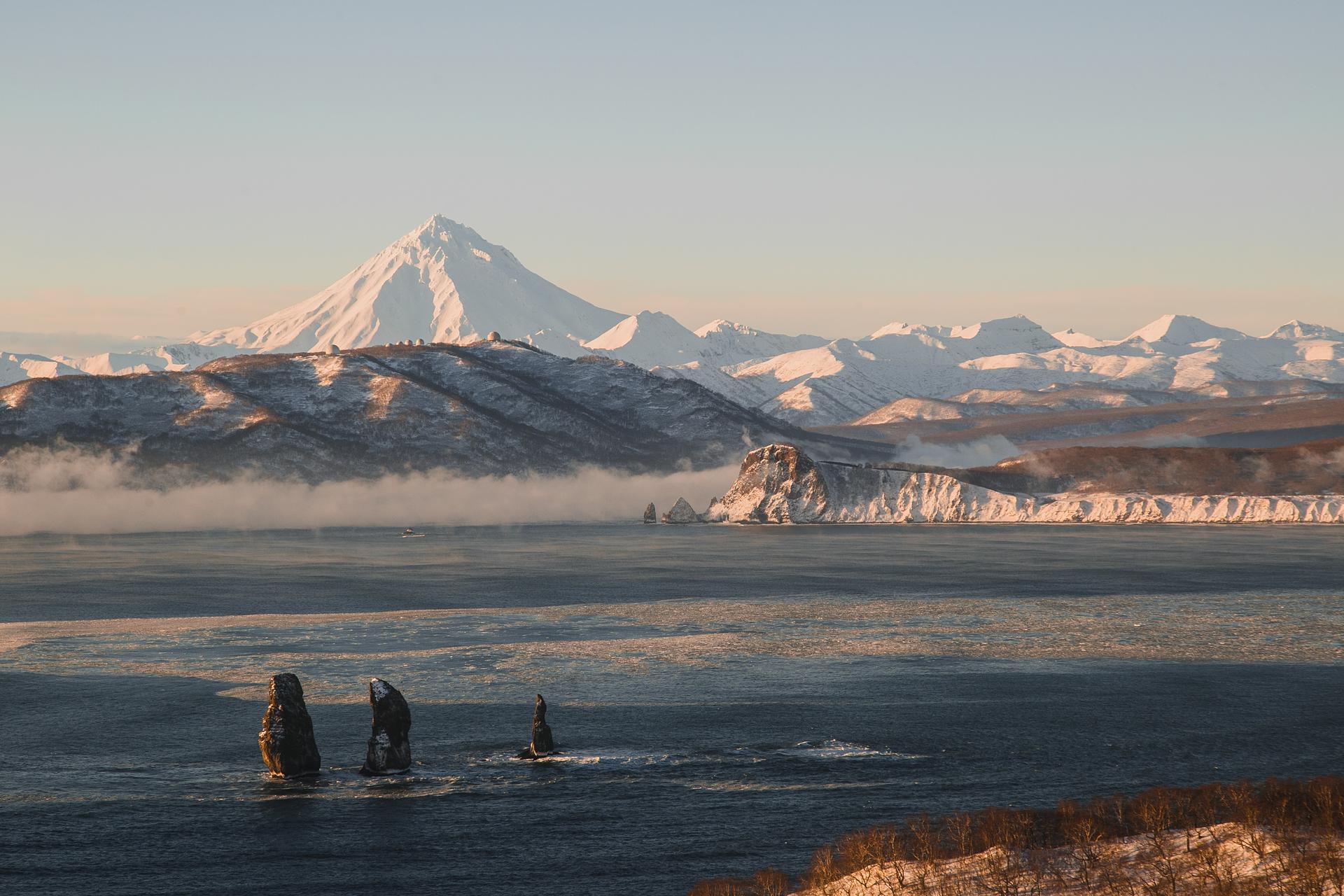 Первая остановка на маршруте после переезда по льду замёрзшего озера в окружении живописных сопок – на берегу могучего Тихого океана. Вам предстоит прогулка по абсолютно дикому пляжу с чёрным вулканическим песком. Насладитесь солёным морским бризом!