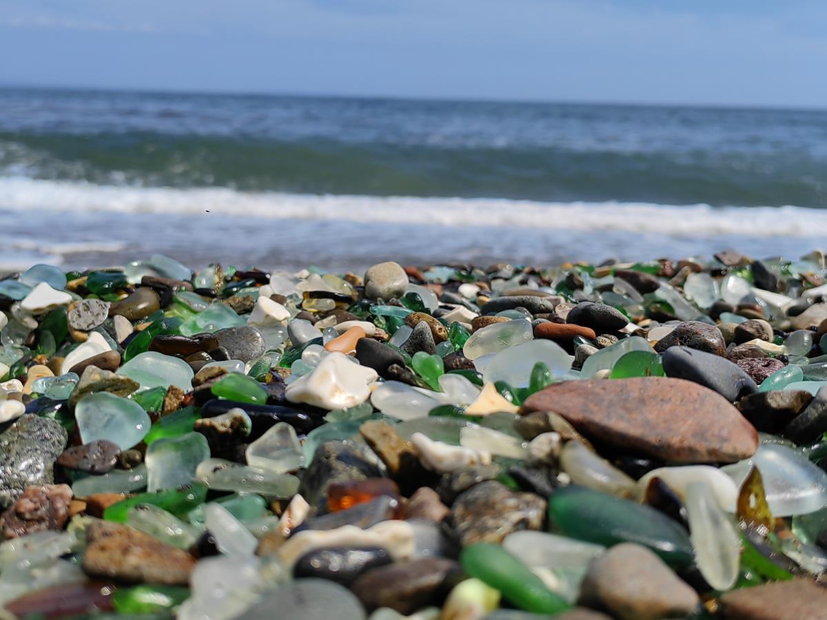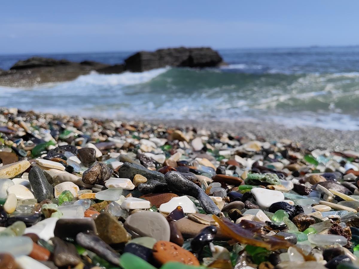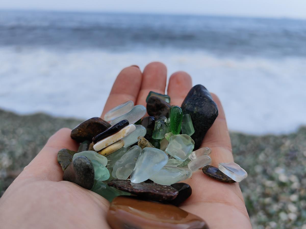 Возвращение во Владивосток вдоль Уссурийского залива с остановкой в бухте Стеклянная, где разноцветные стеклышки, обточенные морем, вперемешку с мелкой галькой.