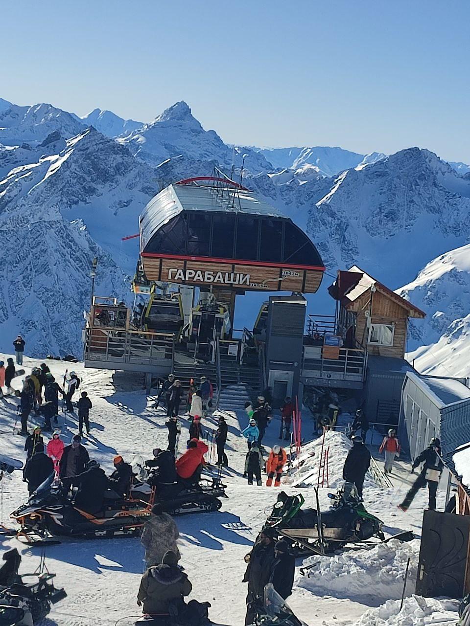 Канатные дороги плавно поднимают нас от поселка Азау (2350 м.) к станциям «Кругозор» (3000 м.), «Мир» (3500 м.) и «Гарабаши» (3847 м.).