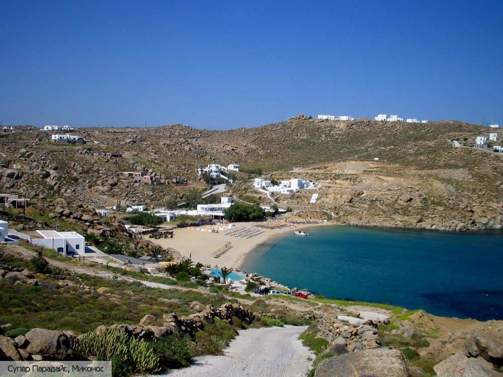 Пляж Супер Пардайс - это самый знаменитый пляж на острове Миконос, популярен среди людей нетрадиционной ориентации и студентов. Он расположен в 7 км юго-восточнее города Миконос. Пляж оборудован душевыми кабинками, работает служба спасения, зонтики и шезлонги нужно брать в аренду, а можно просто положить полотенце на песок.