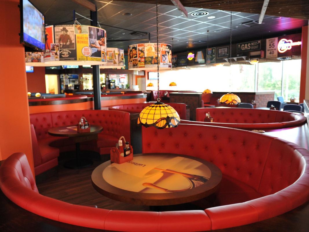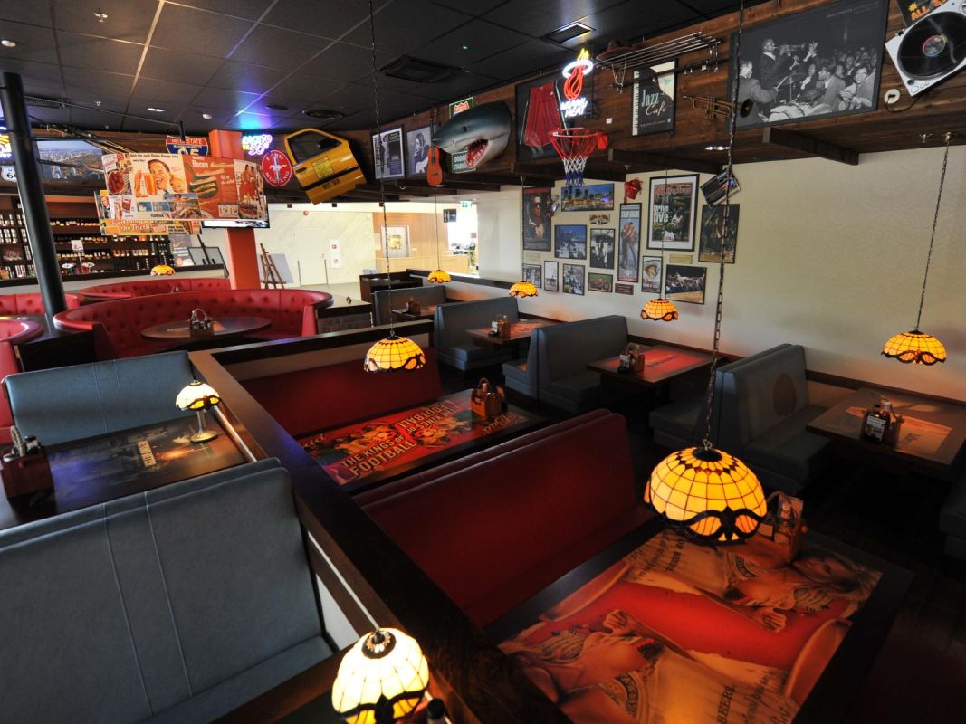В интерьере ресторана использованы интересные американские детали: неоновая реклама, постеры и фотографии известных политиков, кинозвезд и спортивных легенд Америки.
