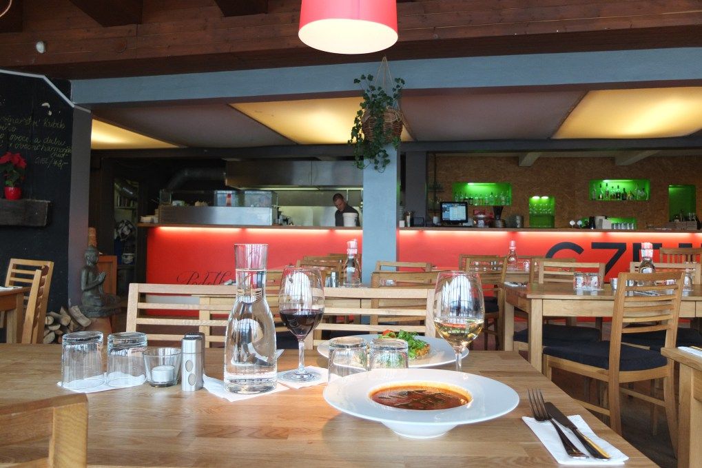 Ресторан лежит в стороне от шумных туристических троп. Отдохнуть и перекусить можно не только в зале, но и на террасе с прекрасным видом на реку Влтаву. В меню присутствуют блюда для веганов, вегетарианцев, а также для любителей стейков. Здесь представлен широкий выбор пива марки Bernard.