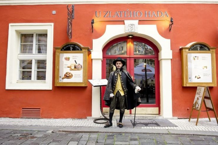 Ресторан «У золотого змея» находится в исторической части Праги, на углу улиц Карлова и Лилиова; именно здесь была открыта когда-то первая пражская кофейня. Сегодня гостям заведения предлагают отведать традиционные блюда чешской кухни, отличное чешское пиво или моравское вино.