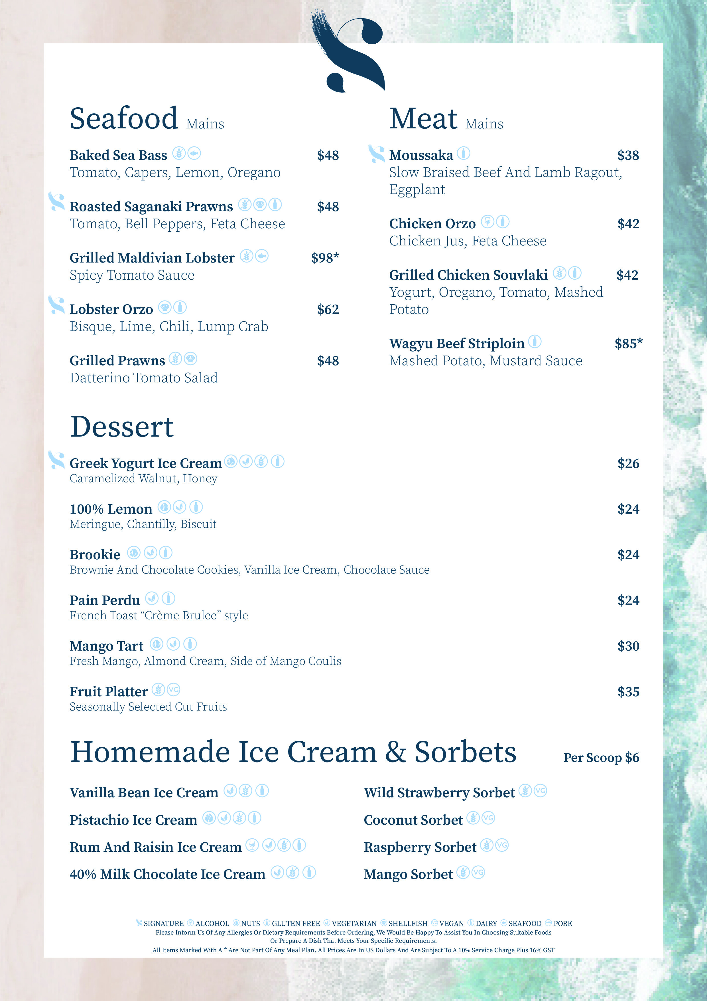 Ресторан специализируется на греческой и средиземноморской кухне, где в течение дня подают разнообразные свежие и ароматные блюда. Гости могут насладиться изысканными блюдами, любуясь захватывающими видами и нежным морским бризом.