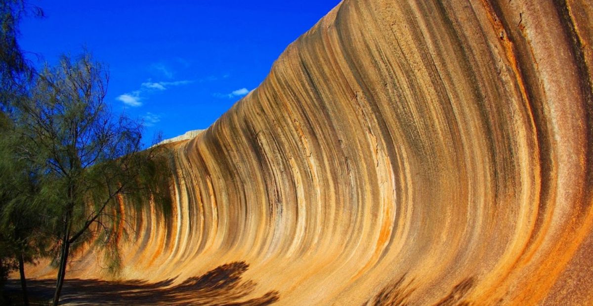Волновая Скала (Wave Rock) расположена в Западной Австралии, в 3 километрах к востоку от городка Хайден. Скала высотой 15 метров и шириной 110 метров имеет форму гигантской волны, поверхность которой "разрисована" серыми, красными и жёлтыми полосами.