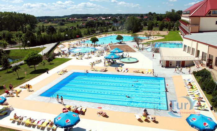 Аквапарк Тропикана в городе Миколайки (самом известном курорте на Мазурских озерах в Польше) по праву считается одним из главных развлекательных центров для туристов и местных жителей. Аквапарк является частью отеля Golebiewski Hotel и входит в состав большого рекреационного комплекса. К услугам его гостей: спортивный бассейн длиной 25 метров, бассейны с искусственной волной, с водно-воздушным гидромассажем, бассейн-река, а также грязевые, магниево-кальциевые, йодно-бромовые, морские, торфяные и щелочные ванны-джакузи, паровая и сухие (еловая, эвкалиптовая, травяная) сауны, ледяная и соляная пещеры. Процедуры гидротерапии улучшат самочувствие и кровообращение, снимут напряжение и боль в мышцах и суставах. Лечебные ванны-джакузи способствуют физической и психологической релаксации, а гидромассаж и СПА-процедуры оказывают положительное влияние на нервную систему и систему органов дыхания. В Аквапарке есть четыре водных горки с общей длиной 700 метров, горка для спуска на понтоне и горка-мельница. Для малышей оборудована детская зона с бассейном-лягушатником, температура воды в котором поддерживается на уровне 35-36 градусов. Рядом с бассейном расположена песочница с детскими горками и фигурами сказочных персонажей. В летнее время работают открытые плавательный бассейн и бассейн с джакузи. У входа в Аквапарк расположен магазин, в котором можно приобрести надувные круги, нарукавники, игрушки и купальники.