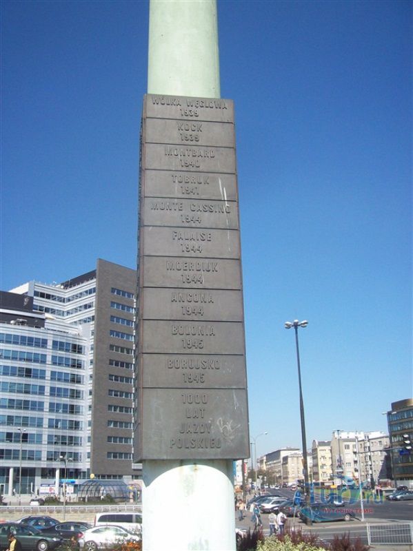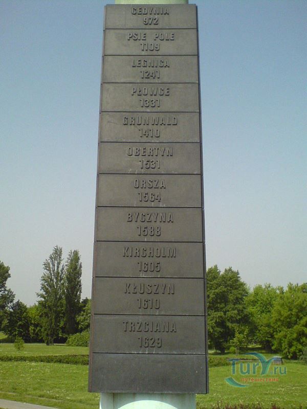 В нижней части колонны на латунных табличках видны надписи с названиями 43 самых значительных сражений польской кавалерии и их датами, где главная роль отводилась именно кавалерии. Скульптором табличек был Marek Moderau, который в своей работе использовал снаряды, полученные от военных.