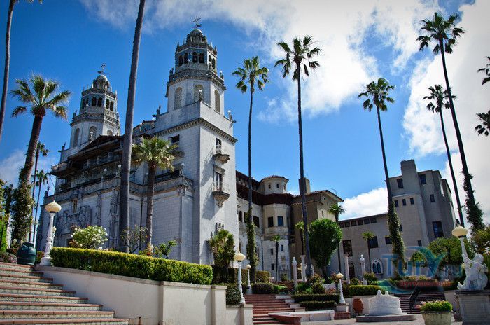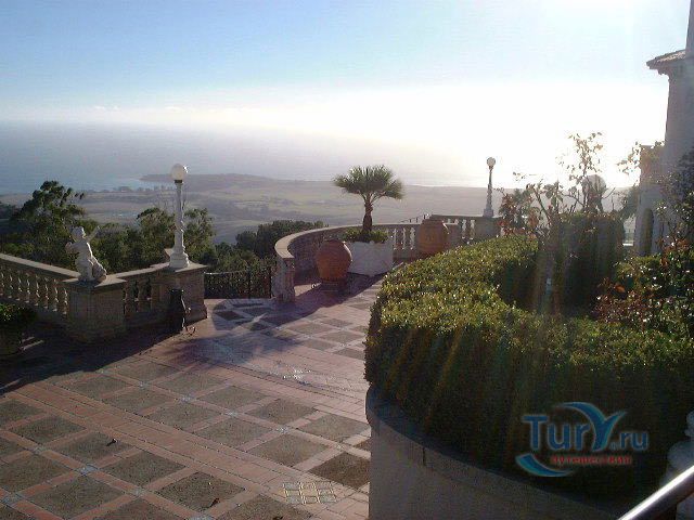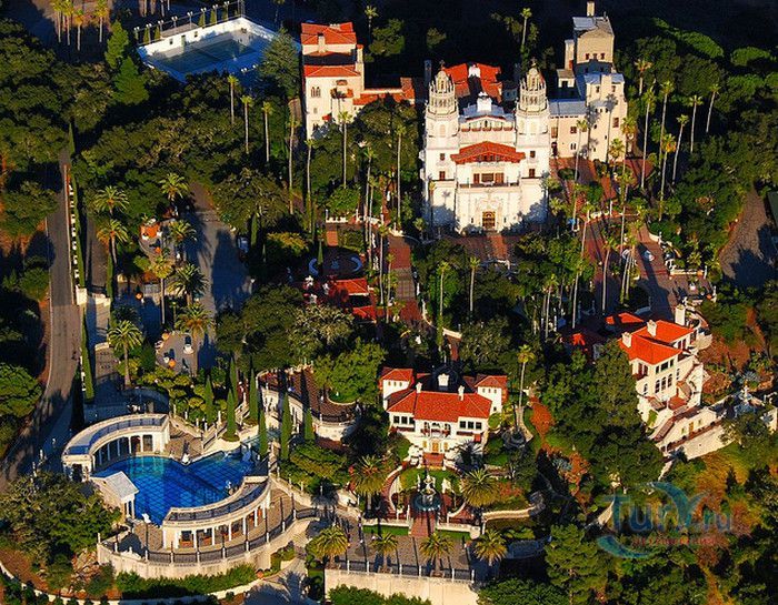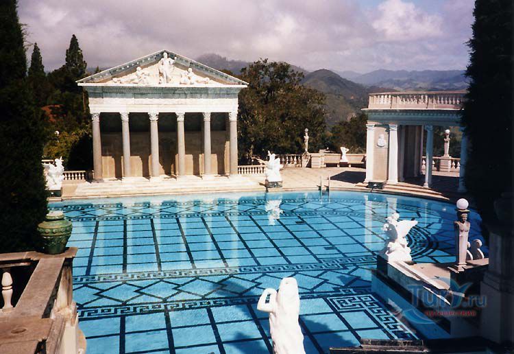 Старый Свет не жалел сокровищ для придания блеска дворцу Уильяма Рэндольфа Херста на высоком тихоокеанском берегу. Замок Херста расположен в 215 милях к югу от Фриско, на горе Сан Симеон, ровно посередине между Сан-Франциско и Лос-Анжелесом - ни на что не похожая, в каких-то деталях даже красивая усадьба. На ее великолепие - впрочем, давящее - владелец затратил неслыханные суммы. Он разграбил всю Европу, чтобы обставить свой дом, а чего не смог купить, то приказал скопировать. Херст называл свою усадьбу "Чарующая высота" (La Cuesta Encantada). Если только подумать, сколько денег он потратил и сколько любви вложил в обстановку дома, то сразу хочется называть этот дом замком. Не зная замок, трудно представить себе его владельца, но зато, если вспомнить фильм Орсона Уэллса "Гражданин Кейн", где прообразом главного героя послужил Уильям Рэндольф Херст, можно вообразить себе этого человека. Принято хвалить два огромных бассейна в замке Херста. Тот, что внутри, - копия с римских терм, а тот, что в саду, рассчитан на 1,3 миллиона литров воды. У его края стоит греческий храм, украшенный классическими статуями и колоннами, от которого открывается прекрасный вид на холмы. Усадьба расположена высоко над калифорнийским побережьем, но отсюда видны океан и маленький порт, куда по распоряжению Херста и прибывали части самого здания, полностью оборудованные комнаты, ящики с мебелью и произведениями искусства. Херст унаследовал землю и состояние своего отца, умершего в 1891 году магната-горнопромышленника Джорджа Херста. Сыну не раз удавалось приумножать эти богатства: он занимался газетным делом и вошел в историю как один из создателей "желтой прессы" (Yellow Press), журналистики сенсаций. Строительные работы в Сан-Симеоне начались в 1919 году после смерти матери Херста. Для претворения своих мечтаний в жизнь он нанял архитектора Джулию Морган. Итальянские, французские, испанские и мавританские стилевые элементы образуют причудливую смесь, а предметы искусства совершенно разных эпох и сталей скомпонованы Херстом просто по собственному разумению. К примеру, огромная столовая воспроизводит зал в средневековом рыцарском замке. Это грандиозных размеров помещение набито всякими предметами из разных эпох: фламандские гобелены, "античные" церковные скамьи, деревянные панно с изображением святых, флаг из Сиены с фамильными гербами, - настоящий винегрет. Стол такой длинный, что нужен театральный бинокль, иначе не разглядеть: что там, на другом конце. На некотором расстоянии друг от друга на столе стоят подсвечники и блюда с крышками для сохранения тепла. Херст и его возлюбленная, актриса Марион Дэвис, поддерживали сталь, который, как и замок, иначе, чем расточительным, не назовешь. Многие голливудские звезды наезжали сюда с визитом: Чарли Чаплин, Мэри Пикфорд, Рудольфо Валентино, Гари Купер, Кларк Гейбл, Кери Грант. К большому замешательству многих нервных гостей был у Херста и частный зоопарк: яки, медведи, обезьяны и кенгуру. Как обычно, все кончается печально. После смерти Херста его наследники не совладали с огромным хозяйством и вынуждены были передать замок в собственность американского правительства. Теперь это федеральный музейный комплекс, доступный для осмотра каждому страждущему туристу. Вам покажут документальный фильм из отрывков частных и документальных съем
