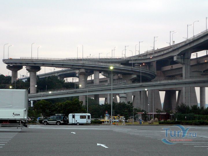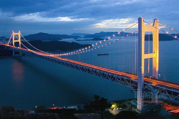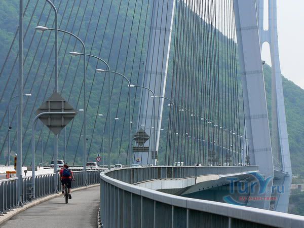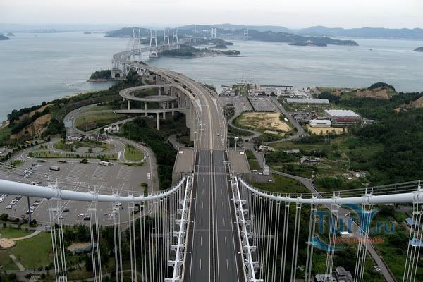 С 10 апреля 1988 года, когда состоялось открытие моста Сэто-Охаси, все четыре крупных острова Японии оказались связаны между собой. Мост - высочайшее достижение современного инженерного искусства. Действительно впечатляющая картина: мост вьется от острова к острову над великолепным Внутренним морем. За счет реализации этого проекта, который на сегодняшний день является самым значительным техническим предприятием Японии, стало возможным совсем быстро добраться от северного, по-сибирски холодного Хоккайдо - через Хондо - к субтропически теплым гаваням Хонсю и к заполненным паломниками храмам Сикоку на юге. Новый мост перекинут через Внутреннее Японское море (Сэто) от острова Хонсю до острова Сикоку, причем это один из самых прекрасных островных ландшафтов мира. Мост, проезд по которому подлежит оплате, соединяет города Курасики на Хонсю и Са-кайдэ на Сикоку, элегантно проходя через пять маленьких островов и преодолевая тем самым расстояние в 12 километров. Было бы вообще-то правильнее называть его мостами, потому что этот невероятный проект включает в себя именно несколько мостов, построенных по разным техническим принципам. У самого длинного южного подвесного моста Бисан расстояние между опорами равно 1100 метрам, это пятый по длине мост в мире. Высота большей из двух свай - 194 метра. Значит, обе они существенно выше пирамиды Хеопса и составляют примерно две трети от высоты Эйфелевой башни. Говорят, будто бы стальные канаты, которые использовались при строительстве моста, были такой длины, что трижды могли бы опоясать земной шар. Во время прилива мост все равно находится на высоте 65 метров над водой, а это позволяет танкерам и океанским судам беспрепятственно входить во Внутреннее Японское море. Мост Сэто-Охаси - двойной, то есть по нему проходит и железная дорога, и автострада. Верхняя часть моста - четырехполосная магистраль, а нижняя предназначена для поездов, в том числе и для Синкансэн.