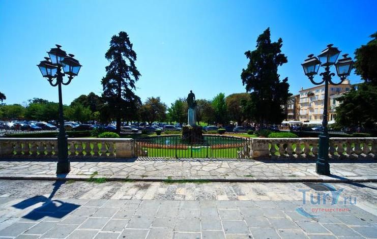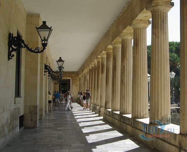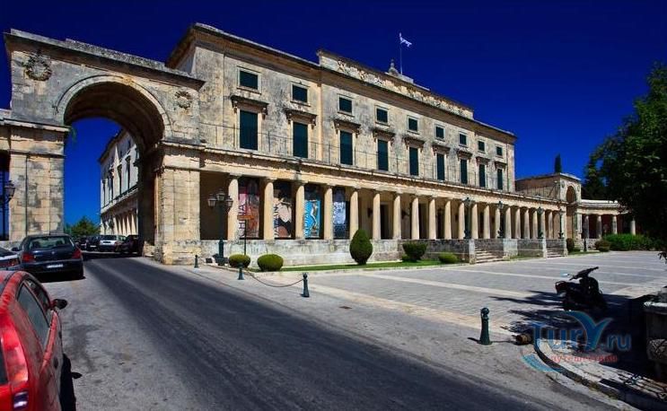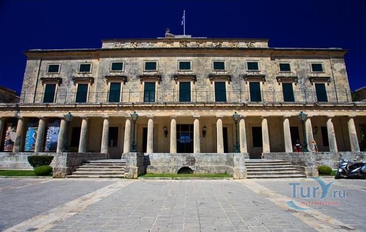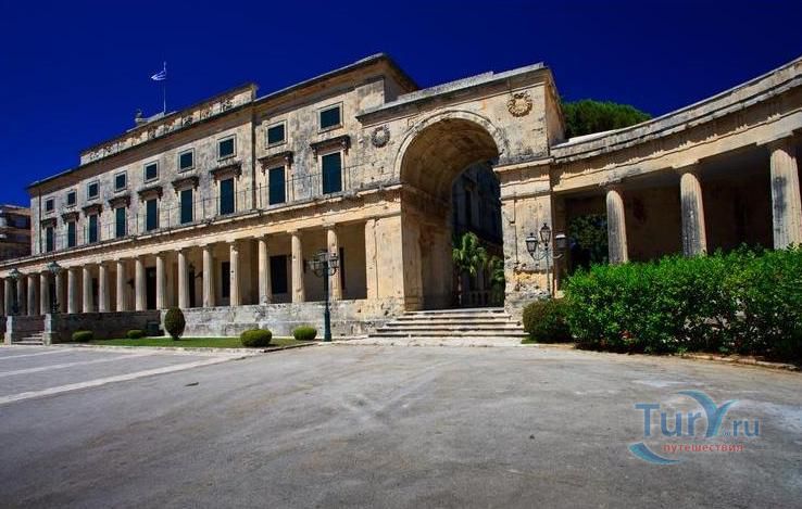 Дворец Святых Михаила и Георгия, также известный как Королевский дворец или городской дворец, расположен в северной части площади Спианада. Греческое название "Palaia Anaktora" (Παλαιά Ανάκτορα: буквально "старый дворец"). Это было первое неоклассическое здание современной Греции и остается одним из лучших образцов этого стиля, и является вторым по величине в Греции. Дворец был построен в 1819-24 годах по проекту английского инженера полковника сэра Джорджа Уитмора из мальтийского известняка. Дворцовый комплекс состоит из главного здания и двух симметрично расположенных крыльев с обеих сторон. Карниз крыши украшен символами семи Ионических островов, созданными местным скульптором Павлос Проссалентис. Трехэтажное здание, фасад которого украшен дорическими колоннами, с обоих концов расположены триумфальные арки, каждая из которых названа в честь одного из святых. Парадная лестница ведет к двум большим комнатам: тронный зал и столовая. Во дворце роскошный интерьер - статуи, хрустальные люстры, фрески и трон английского комиссара. Вокруг дворца зеленеют сады, а перед ним стоит статуя Мейтленда, который сделал важный вклад в историю и развитие острова - строительство 11-километрового водопровода для снабжения города питьевой водой.