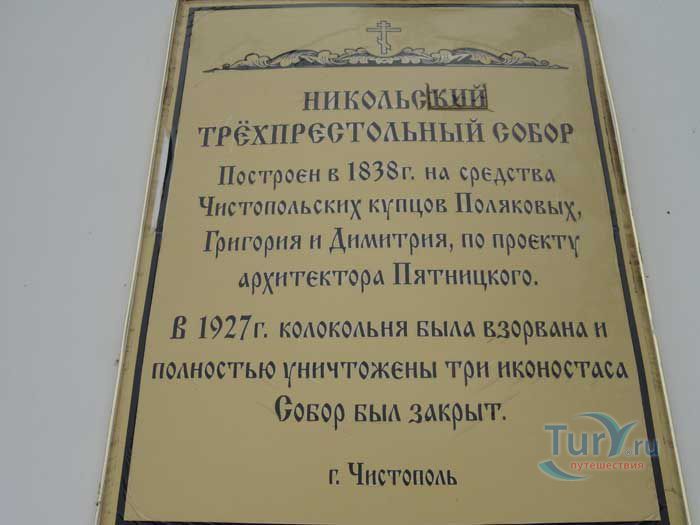 Никольский собор в Чистополе находится на высоком берегу реки Камы и представляет собой яркий образец позднего классицизма. Выстроенный известным и талантливым архитектором Петром Григорьевичем Пятницким собор является одним из самых ценных памятников архитектуры в Казанском крае. Трехпрестольный каменный Никольский собор во имя святителя Николая Чудотворца был построен в 1838 году на средства купцов Григория Андреевича и Дмитрия Андреевича Поляковых. Величественный белокаменный Никольский собор сегодня стоит в своем великолепии, принося радость и утешение для верующих. Внутри храма Никольского собора особая атмосфера, которая благоприятно воздействует на всех, кто приходит в храм. В настоящее время в церкви хранятся многие казанские святыни: чудотворные списки Казанской и Тихвинской икон Божией Матери. Чудотворная Феодоровская икона Пресвятой Богородицы (главная святыня бывшего Феодоровского женского монастыря города Казани), чудотворная икона святителя Николая Мирликийского "Куюковская", обретенная 24 июня 1897 года в селе Куюки под Казанью, и многие другие святыни.