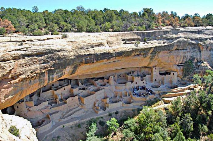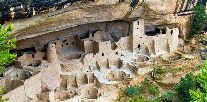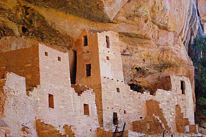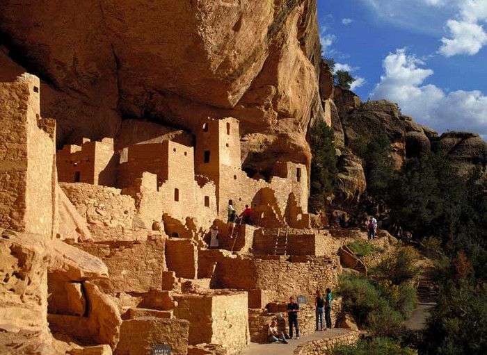 Когда в конце XIX века люди снова открыли Скальный дворец, он более всего напоминал заброшенный средневековый город Старого Света. 18 декабря 1888 года Ричард Уэсерилл и Чарльз Мейсон, два ковбоя из штата Колорадо, выехали на крутой обрыв горного ущелья - и обомлели: прямо перед ними, будто врезанные в отвесные скалы противоположного склона, возвышались каменные стены и башни то ли крепости, то ли замка. Казалось, будто сюда, в самое сердце Северной Америки, по ошибке забрели рыцари-крестоносцы или мавры-завоеватели, воздвигли эту странную цитадель - и ушли навсегда. Вскоре в этой же местности было обнаружено еще несколько аналогичных сооружений, что уже наводило на мысль о некоем загадочном народе, который в стародавние времена соорудил здесь эти города-крепости, а затем таинственным образом исчез с лица земли. И лишь очень не скоро исследователи пришли к выводу, что исчезнувший народ - вовсе не какая-то неизвестная раса, а предки индейцев пуэбло, жившие в далеком прошлом именно здесь, на юго-западе США. Впрочем, своим именем (пуэбло по-испански буквально означает "деревня"') коренные жители континента обязаны испанским колонистам, в XVI веке двинувшимся сюда из Мексики на захват новых земель. Как эти древние индейцы сами себя называли, установить сегодня невозможно. Письменности у них не было, следовательно, письменных памятников они не оставили. Современные индейцы племени навахо прозвали их "анасази" ("древние"). Удивительные свои жилища они построили, не имея ни машин, ни металлических инструментов. А их дома вошли в историю американской архитектуры как первые "многоквартирные дома" на континенте. Скальный дворец (Cliff Palace), открытый Уэсериллом и Мейсоном в тот знаменательный день 1888 года, - самый крупный и наиболее известный из скальных дворцов в Национальном парке Меса Верде, открытом в 1906 году по инициативе Теодора Рузвельта. В середине XIII столетия здесь жили, по-видимому, около четырехсот человек - население целой деревни, строившейся не столько вширь, сколько вверх. Всего во дворце имелось более двухсот жилых помещений, не считая кладовых и так называемых "кивас" - отдельно стоящих ритуальных зданий. Комнаты были украшены настенными росписями, по преимуществу - геометрическими орнаментами. Переднюю часть всего этого "жилищного комплекса" образует ряд открытых террас, на которых, видимо, и происходила повседневная хозяйственная и общественная жизнь деревни. Здесь готовили еду, мололи зерно и т.д. Неподалеку от "Клиф пэлас" вдоль по Ча-пин Меса, горному плато площадью почти в 1000 км2, находятся еще два аналогичных сооружения - "Спрюс три хаус" (Spruce Tree House), укрывшийся под выступом могучей скалы, и "Бэлкени хаус" (balcony House). Первый из них выстроен в три этажа и занимает 66 метров в длину и 27 метров в глубину. Здесь имеется более ста помещений прямоугольной, треугольной и даже круглой формы, которая всякий раз диктовалась соображениями наиболее эффективного использования рельефа скалы. Очевидно, эти неприступные деревни-крепости сооружались в таких местах с учетом прежде всего возможностей обороны. Населяли их земледельцы. Они питались в основном злаками, бобами и крупами, изготовляли корзины, гончарные изделия и ткани, приручили дикую птицу - индейку, которую особенно ценили за вкусное мясо и красивое оперение, и строили небольшие запруды, с